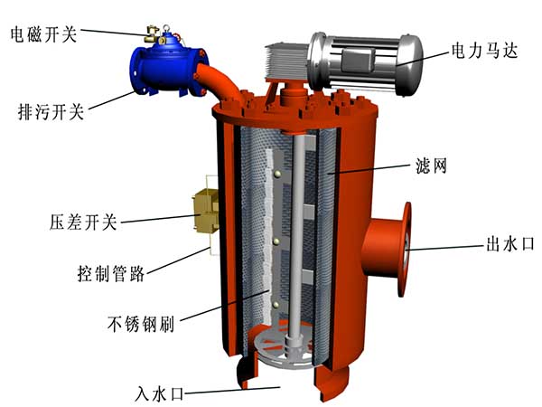 自清洗過濾器主要組件有:電機(jī)、電控箱、控制管路、主管組件、濾芯組件、316L不銹鋼刷、框架組件、傳動(dòng)軸、進(jìn)出口連接法蘭等?!?/p>