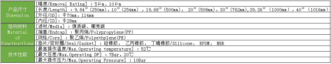 UDF活性炭濾芯技術(shù)參數(shù):