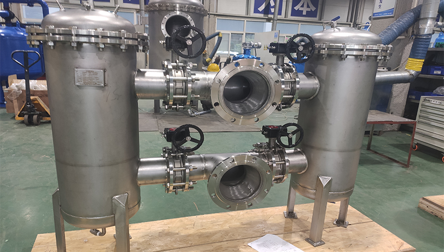 雙聯(lián)過濾器又稱并聯(lián)雙切換過濾器,是由兩只單筒過濾器及全通徑三通球閥組成,結(jié)構(gòu)簡單,使用方便,以達到保證系統(tǒng)安全的目的。 在工作過程中,單筒過濾器濾芯堵塞到一定程度需清洗或更換濾芯時,要停止主機工作來更換濾芯,這樣不僅浪費時間更不能滿足主機連續(xù)工作的需要,雙筒過濾器有效地解決了單筒過濾器這方面的缺點,在不停機的情況下可清洗或更換濾芯來保證主機正常連續(xù)工作。