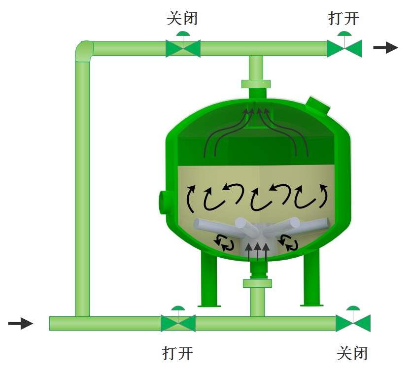 淺層砂過濾器由若干個過濾單元并列組合而成。當系統(tǒng)處于過濾狀態(tài)時,未經(jīng)過濾的水通過自行研制獨特的布水器均勻布水,水以層流狀態(tài)通過濾器內(nèi)的填料層(精制均粒石英砂/石榴石)。當水流過填料層時,雜質(zhì)被截留在填料層內(nèi)。過濾器底部有多個均勻分布的集水器,將過濾后的水均勻地收集并引出,平流過濾,可以使過濾器在高流速下過濾,仍可達到較好過濾的效果。
