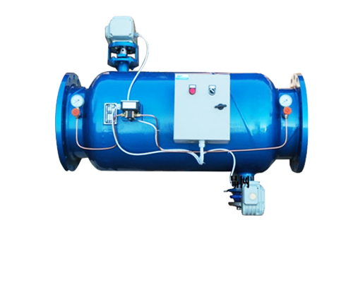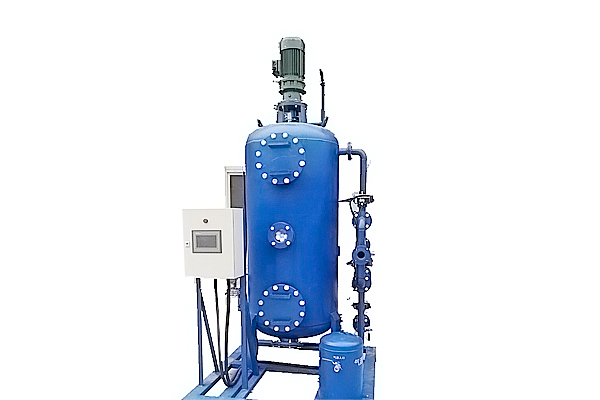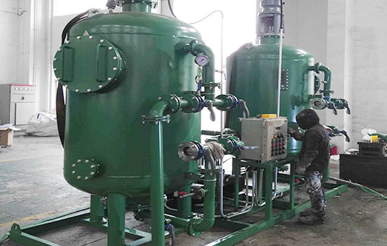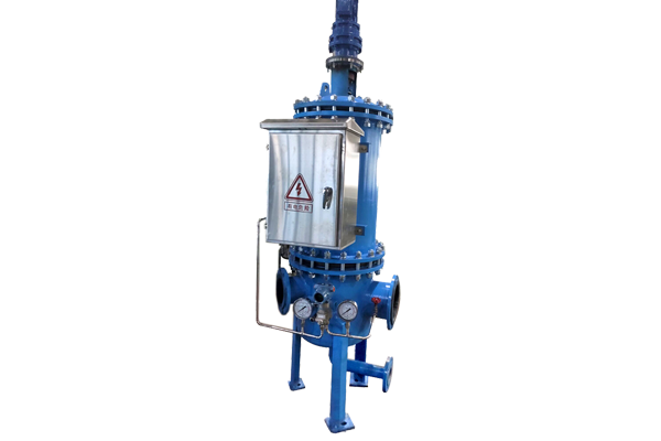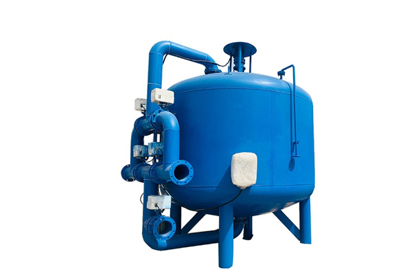 反洗狀態(tài): 隨著雜質(zhì)在填料層中不斷聚積, 內(nèi)部壓頭損失將不斷增大。當(dāng)進、出水壓頭損失達到設(shè)定值時,系統(tǒng)將自動激活定壓差裝置使其轉(zhuǎn)換至反洗狀態(tài),電機帶動攪拌器在罐體內(nèi)轉(zhuǎn)動,更便于清洗聚積起來的雜質(zhì)。當(dāng)系統(tǒng)處于反洗狀態(tài)時,水的流向由底部向上流動,電機帶動攪拌器充分清洗濾料,由排污口直接流出。反洗后系統(tǒng)回復(fù)正常過濾狀態(tài).