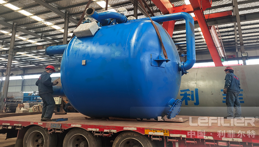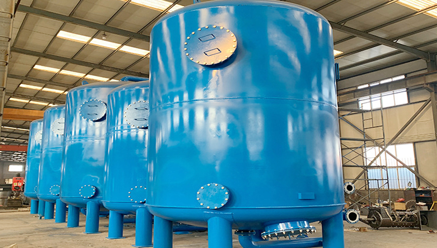 過濾狀態(tài): 當(dāng)系統(tǒng)處于過濾狀態(tài)時, 未經(jīng)過濾的水通過布水器均勻布水,水以層流狀態(tài)通過濾器內(nèi)的濾料層 。當(dāng)水流過濾料層時, 雜質(zhì)被截留在濾料層內(nèi)。過濾器底部有多個均勻分布的集水器, 將過濾后的水均勻地收集并引出, 平流過濾, 可以使過濾器在高流速下過濾,仍可達到較好過濾的效果。