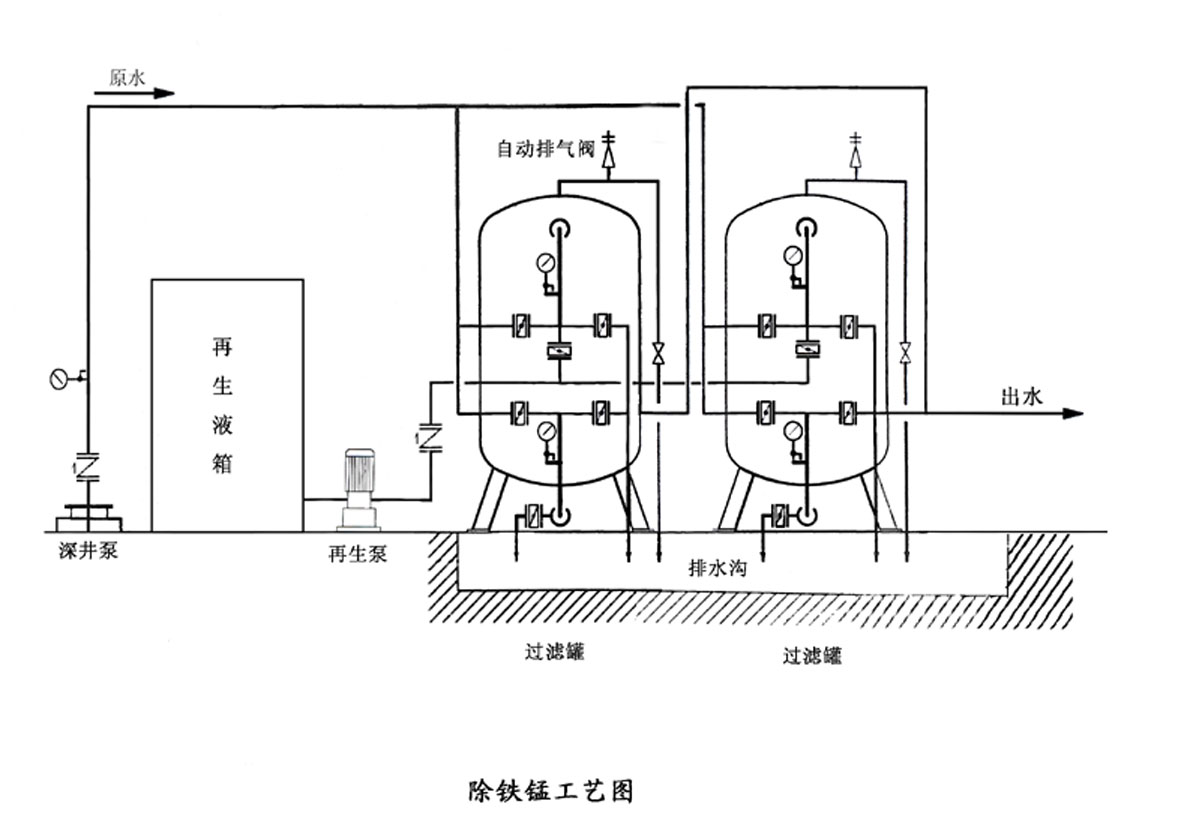 除鐵錳過(guò)濾器由曝氣裝置和錳砂過(guò)濾罐組成;利用氧化法將水中低價(jià)鐵離子和低價(jià)錳離子氧化成高價(jià)鐵離子和高價(jià)錳離子,再經(jīng)過(guò)吸咐過(guò)濾去除,降低水中鐵錳含量。