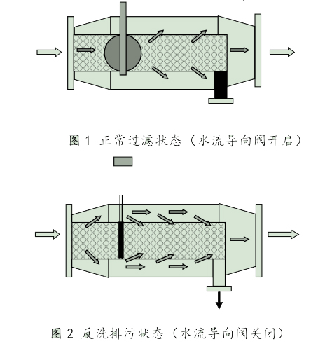 液體從濾網(wǎng)內(nèi)側(cè)流向外側(cè)過程中,固體顆粒被截留在濾網(wǎng)內(nèi)側(cè)。隨著污染物的增多,過濾器污染側(cè)和清潔側(cè)之間的壓差也逐漸增大。當壓差達到設(shè)定值時,壓差表發(fā)訊,過濾器開始自動反沖洗工作過程。電動控制閥門關(guān)閉,濾網(wǎng)內(nèi)外形成負壓,在壓力差的作用下,清潔側(cè)液流從被清洗濾網(wǎng)的外側(cè)流向內(nèi)側(cè),進行反沖洗,聚積在濾網(wǎng)內(nèi)側(cè)的污染物被沖掉并通過排污口排出過濾器;如圖所示